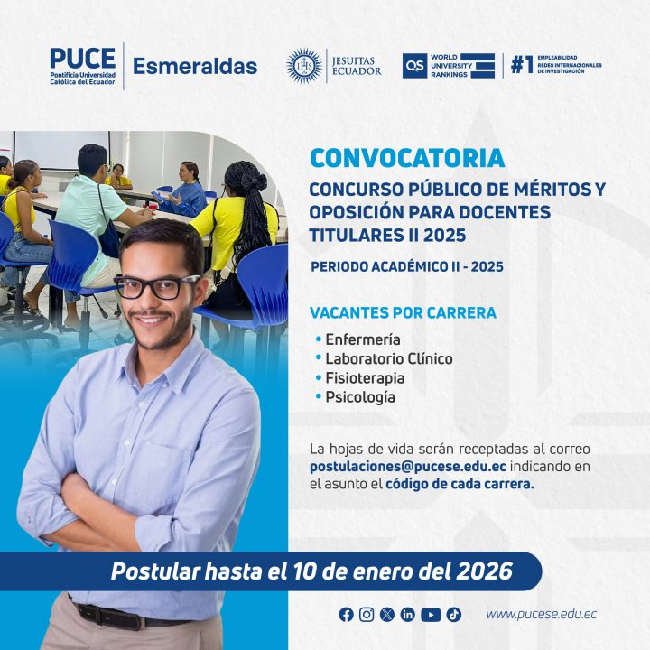 CONCURSO PÚBLICO DE MÉRITOS Y OPOSICIÓN PARA DOCENTES OCASIONALES NO TITULARES PERIODO ACADÉMICO 2025-II La Pontificia Universidad Católica del Ecuador, sede Esmeraldas, con base a lo establecido en la Ley Orgánica de Educación Superior, y el Reglamento de Carrera y Escalafón del Personal Académico del Sistema de Educación Superior, convoca a profesionales para diferentes áreas: […]