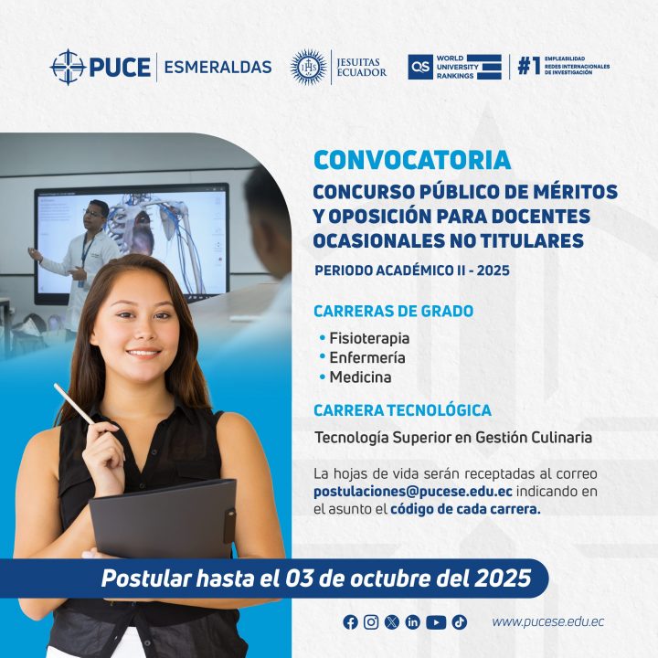 CONCURSO PÚBLICO DE MÉRITOS Y OPOSICIÓN PARA DOCENTES OCASIONALES NO TITULARES PERIODO ACADÉMICO 2025-II La Pontificia Universidad Católica del Ecuador, sede Esmeraldas, con base a lo establecido en la Ley Orgánica de Educación Superior, y el Reglamento de Carrera y Escalafón del Personal Académico del Sistema de Educación Superior, convoca a profesionales para diferentes áreas: […]
